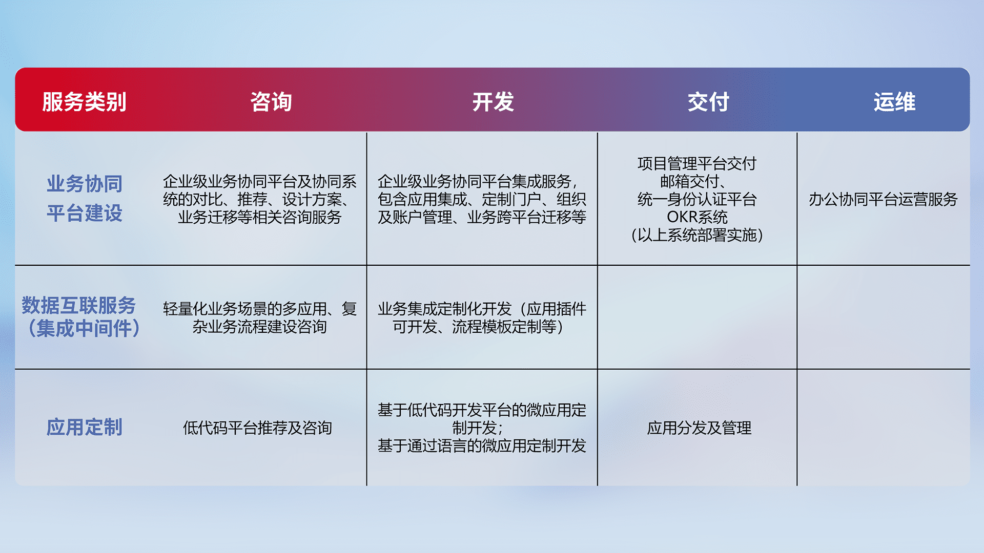 针对钉钉、、、企微、、IDaas等平台级产品提供产品的规划、、、、方案、、、交付、、、定制化开发等服务,,,实现如统一协同办公、、、智能客户服务、、、、混合会议管理、、、、智能数据查询、、、、等业务场景,,,,实现数字化转型。。。。